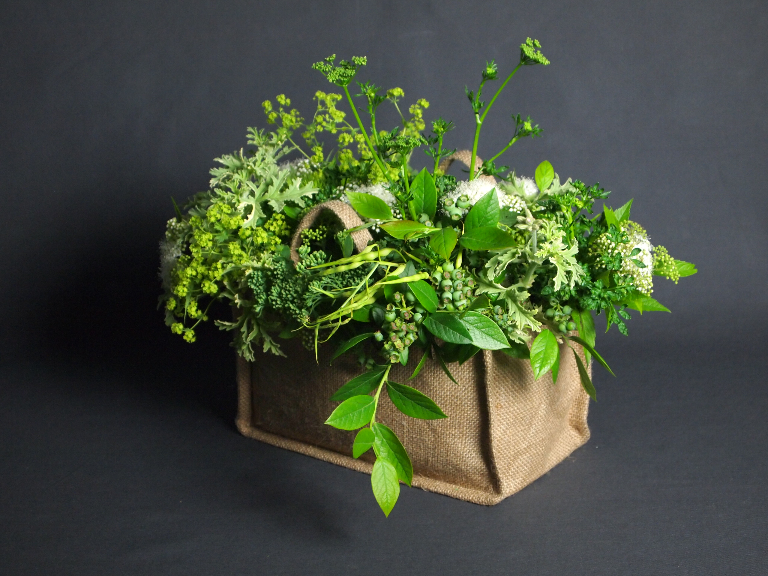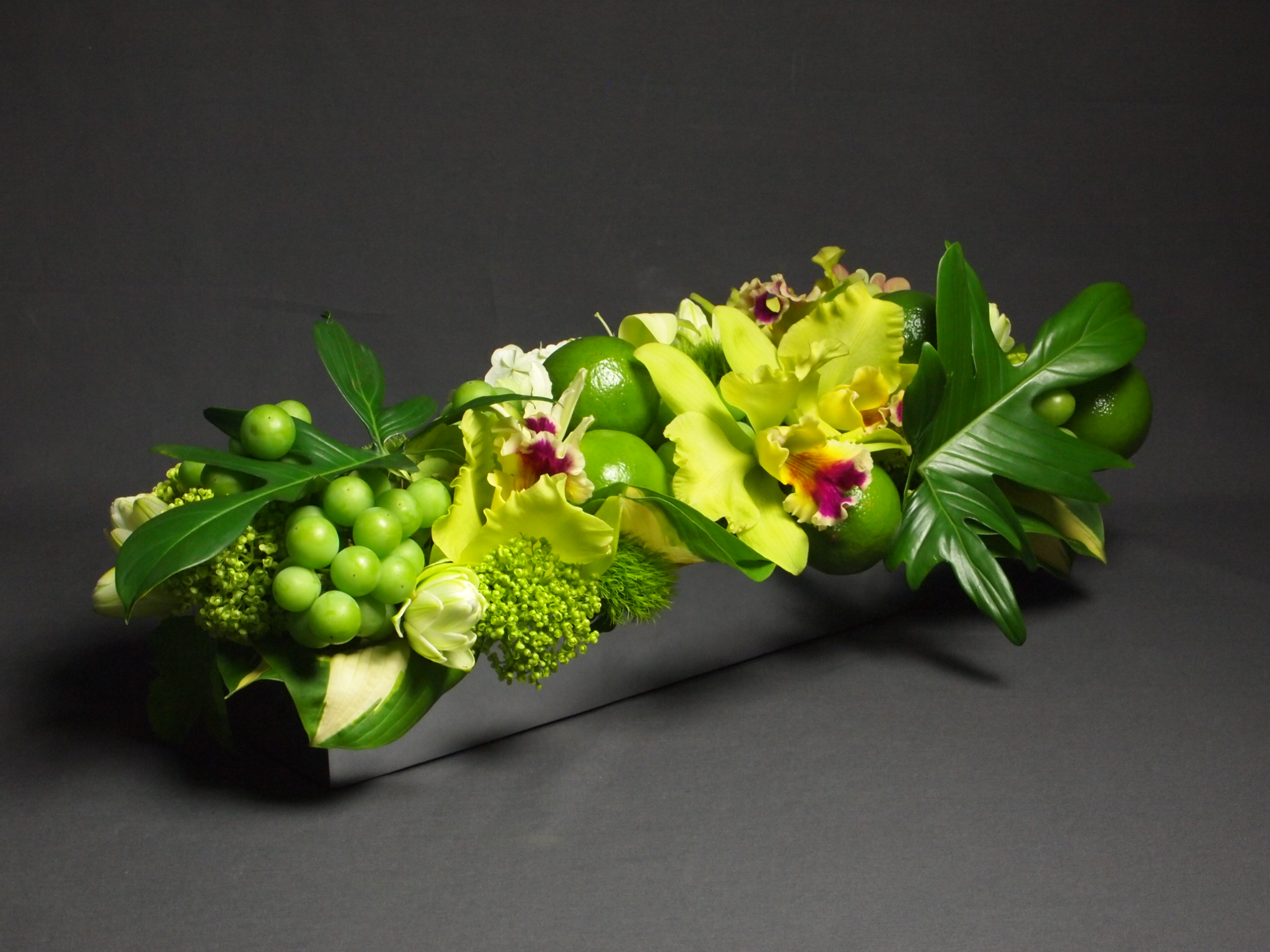 グリーン色の果物に夏の花をミックスしたジューシーなアレンジはリビングテーブルの中央にぴったり。