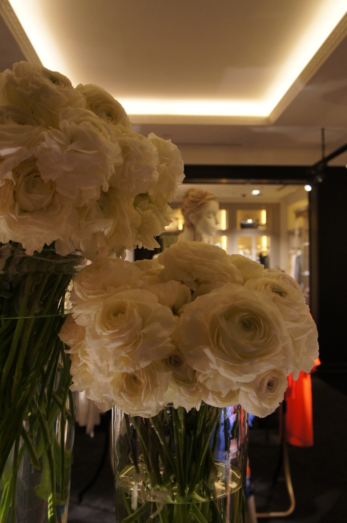 オープニングレセプションパーティーの会場を白いラナンキュラスのみで飾りました。